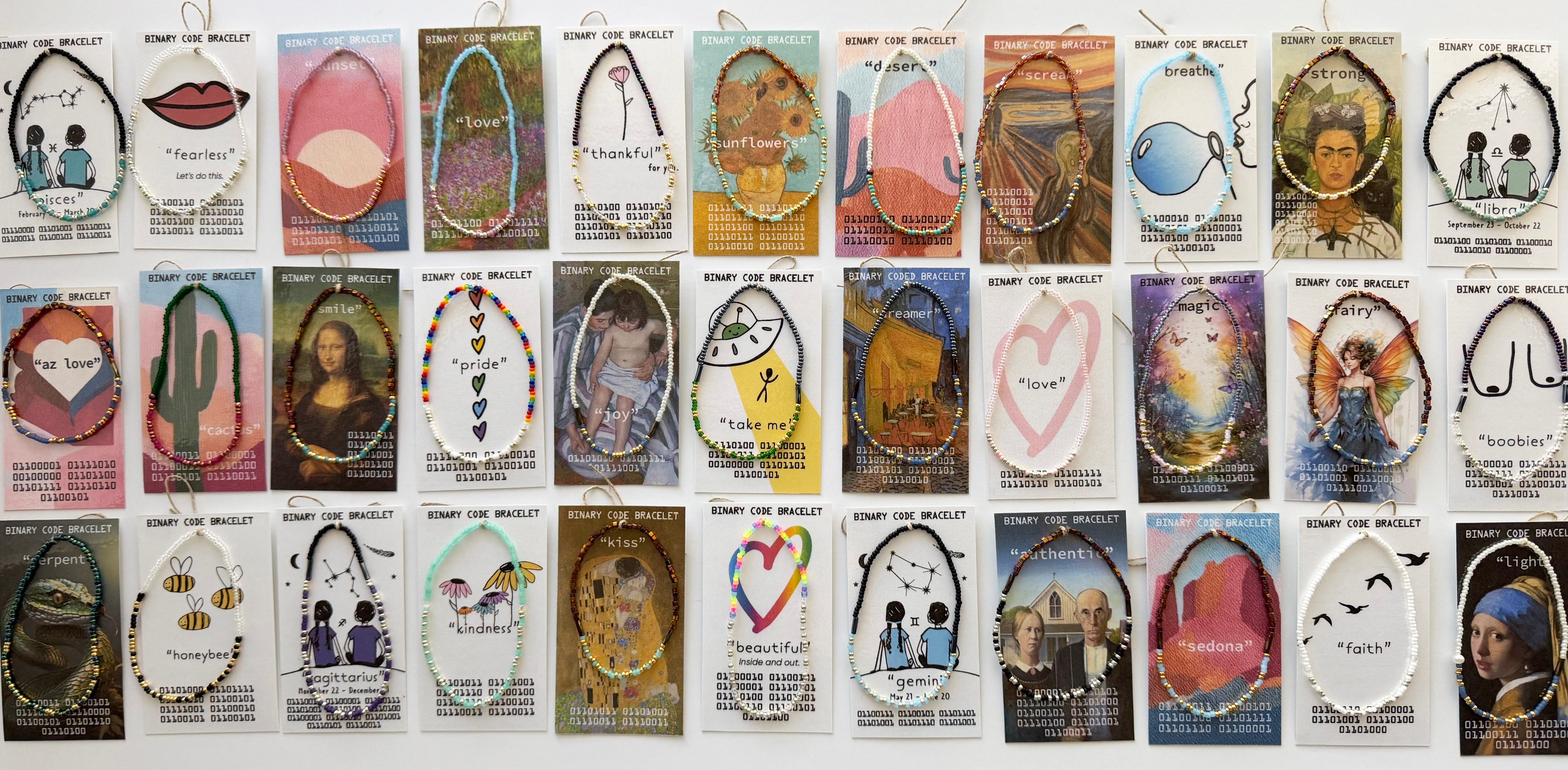 Build a binary code bracelet stack with your zodiac sign and the signs of those you love! On the back of each card is a mini reading!
