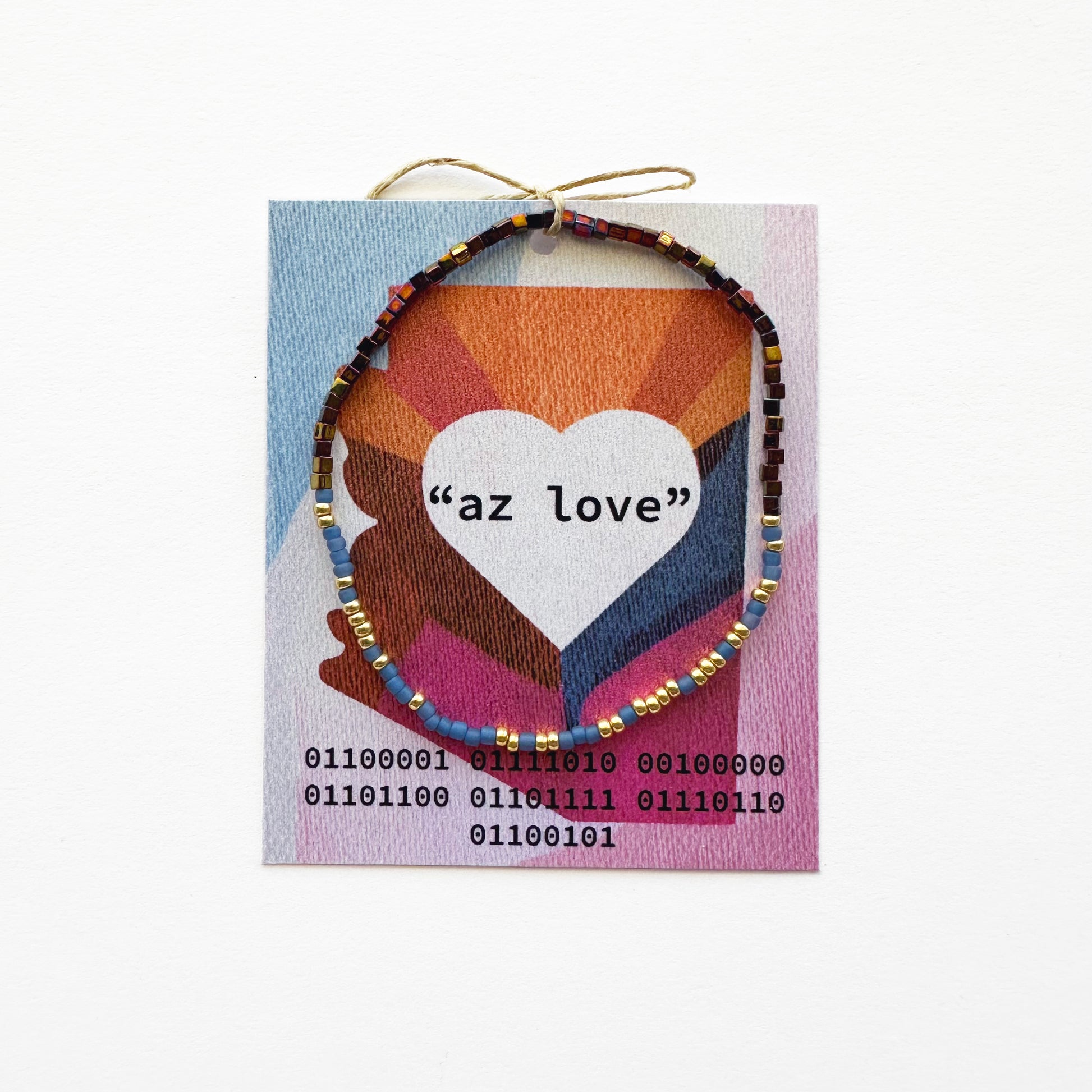 "az love" is coded into this bracelet using colors to represent binary code - the computer language of zeros and ones. It is made from delicate glass beads that are strung on a durable stretch cord for maximum versatility and easy wear.