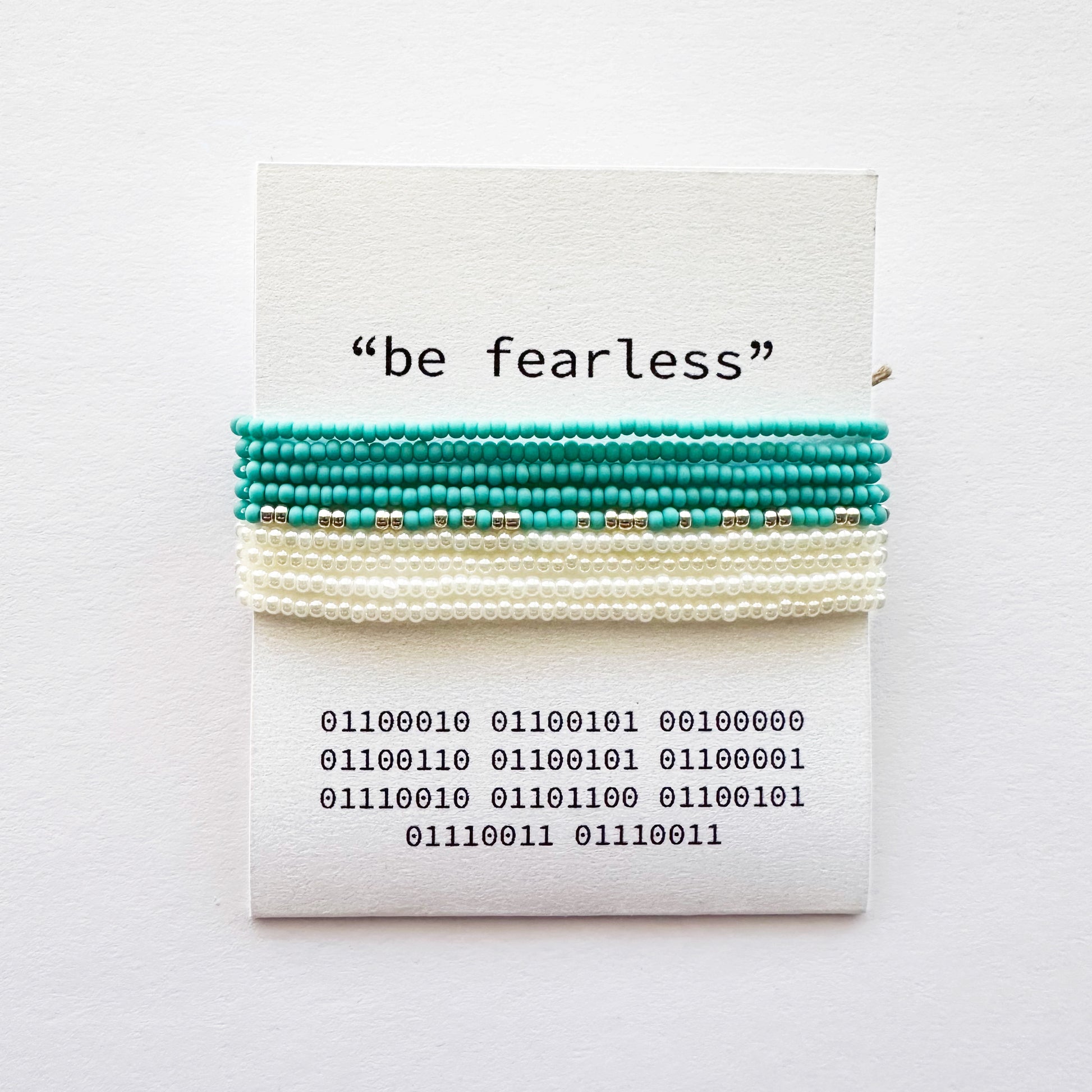 "be fearless" is coded into this necklace/bracelet wrap using colors to represent binary code - the computer language of zeros and ones.