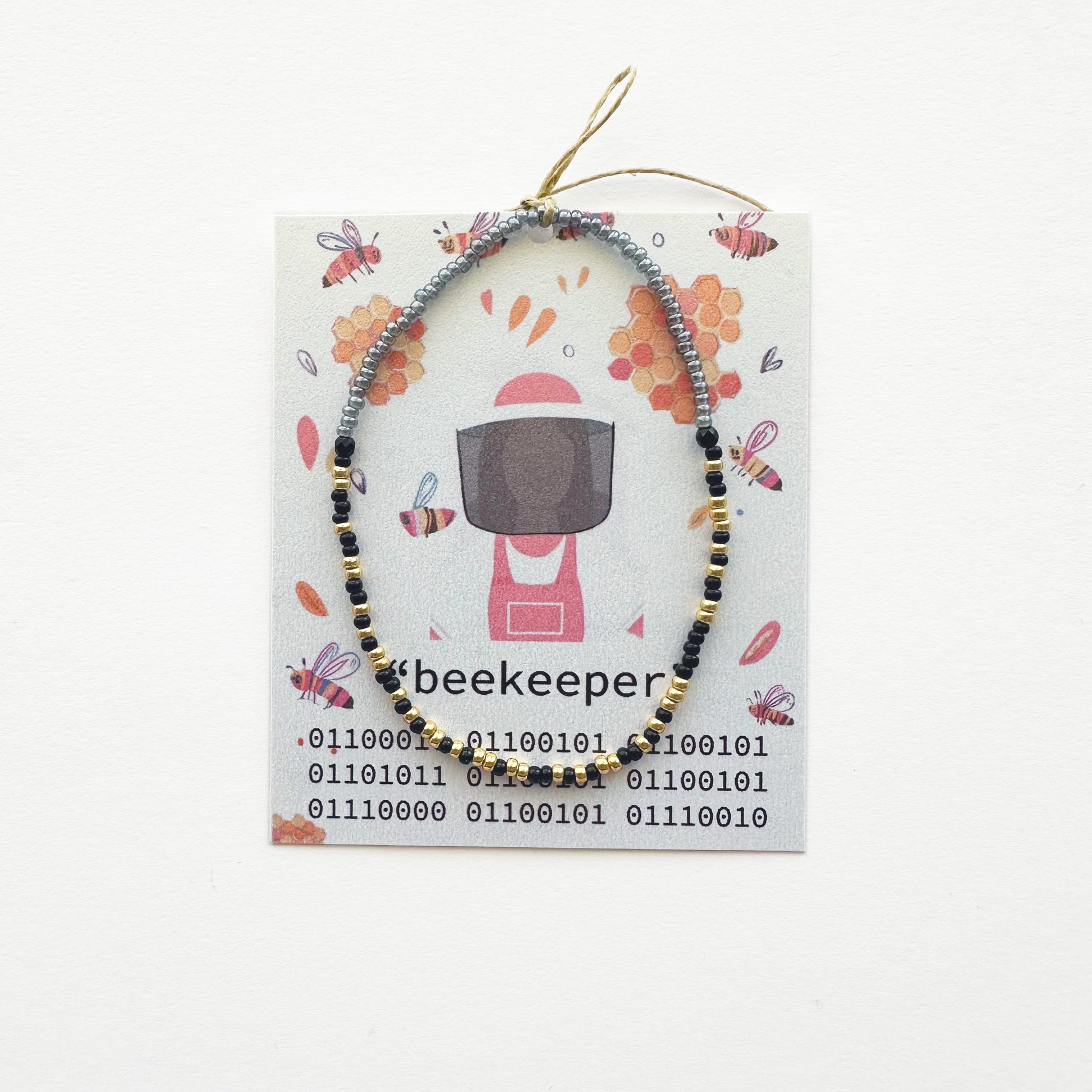 "beekeeper" is coded into this bracelet using colors to represent binary code - the computer language of zeros and ones. It is made from delicate glass beads that are strung on a durable stretch cord for maximum versatility and easy wear.