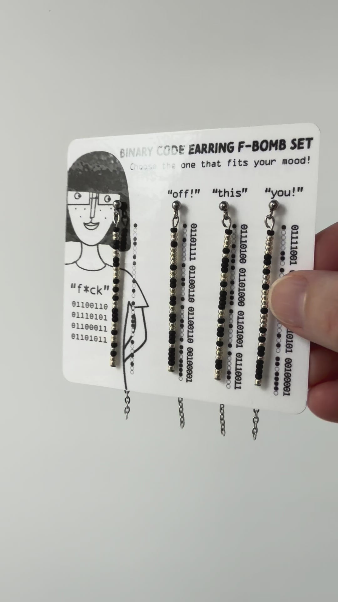 To everyone else, they're just earrings...but you know something they don't! These modern and minimalist earrings have the word "f*ck" coded into one, and is paired with matching "off!," "this," and "you!" earrings so you can choose the combo that best fits your mood! The silver or gold beads - you pick - represent "1" and the black represents "0".