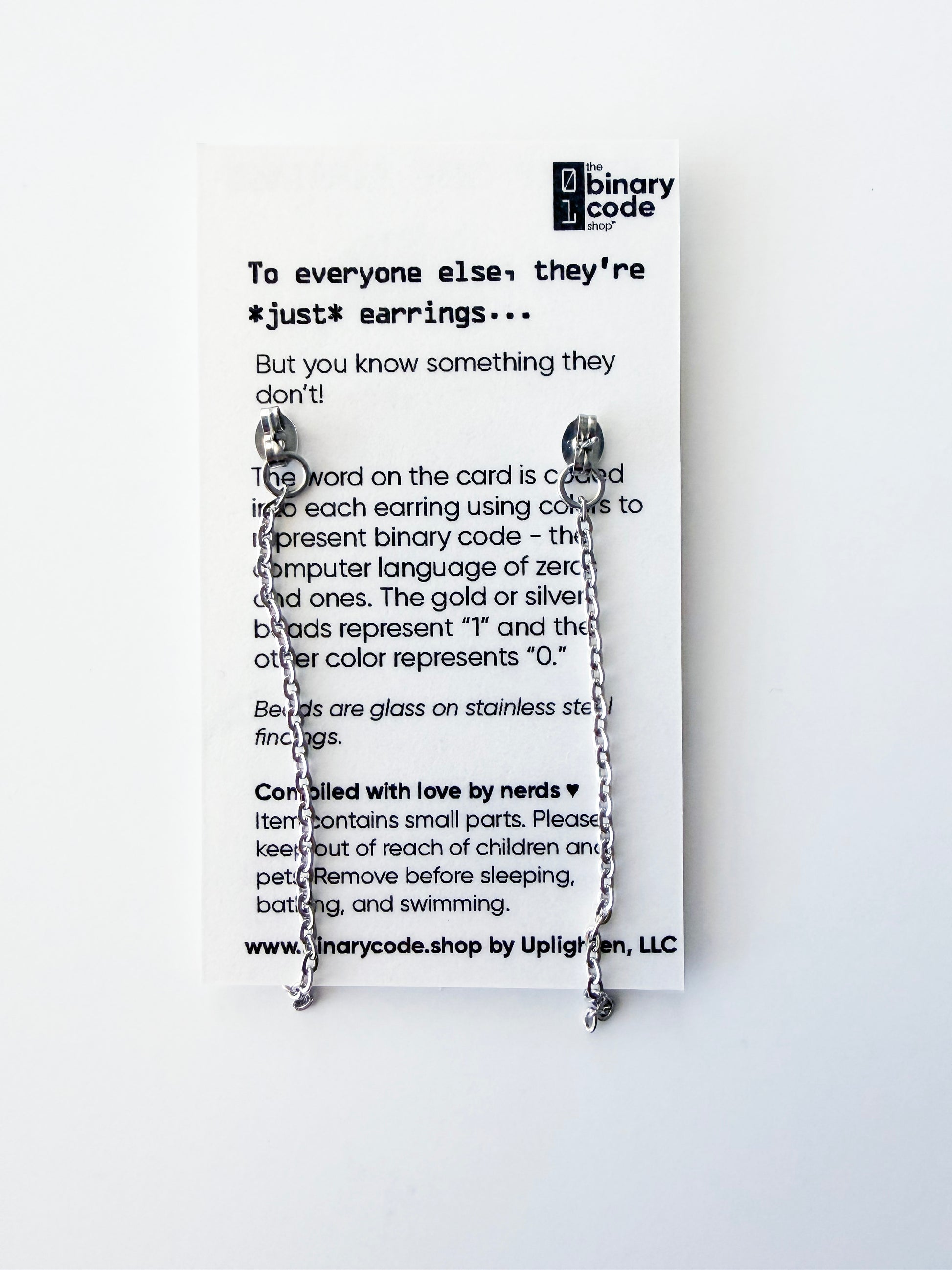 To everyone else, they're just earrings...but you know something they don't! These modern and minimalist earrings have the word "geek" coded into one, and "life" coded into the other! The silver beads represent "1" and the black/iridescent purple represents "0".