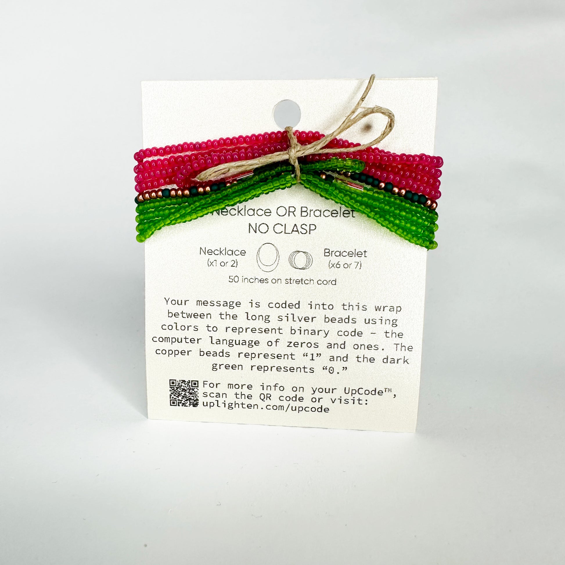 "cactus lover" is coded into this necklace/bracelet wrap using colors to represent binary code - the computer language of zeros and ones.