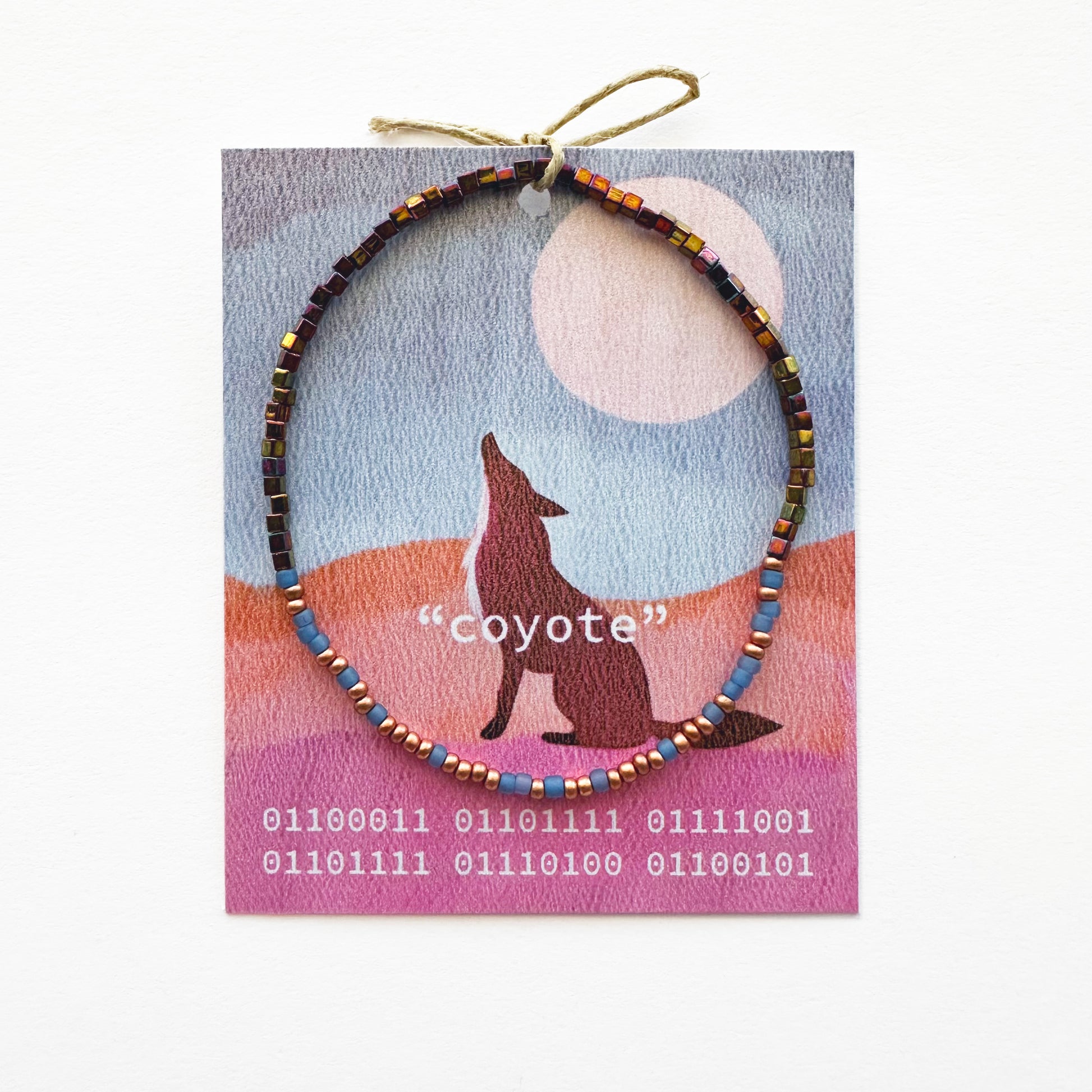 "coyote" is coded into this bracelet using colors to represent binary code - the computer language of zeros and ones. It is made from delicate glass beads that are strung on a durable stretch cord for maximum versatility and easy wear.