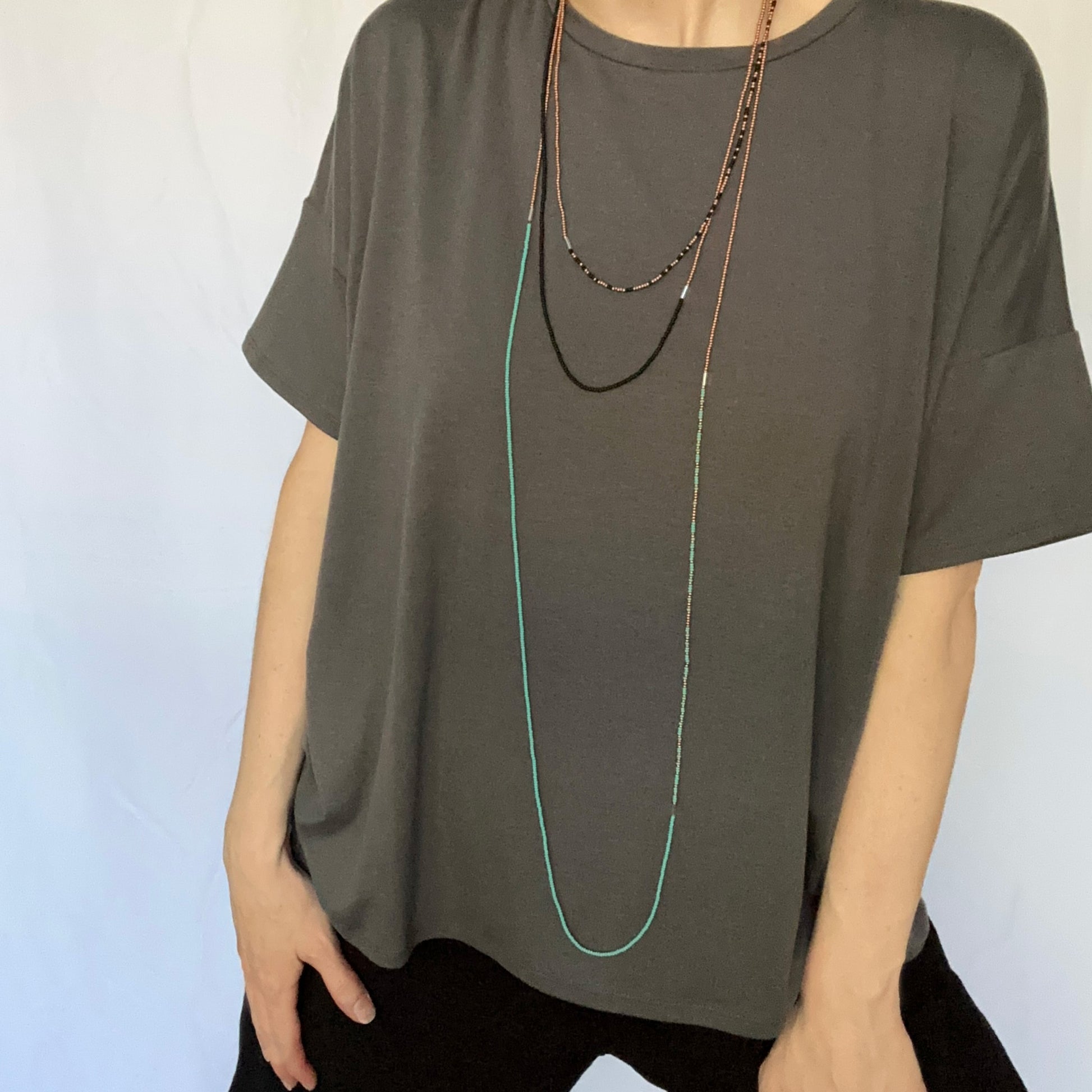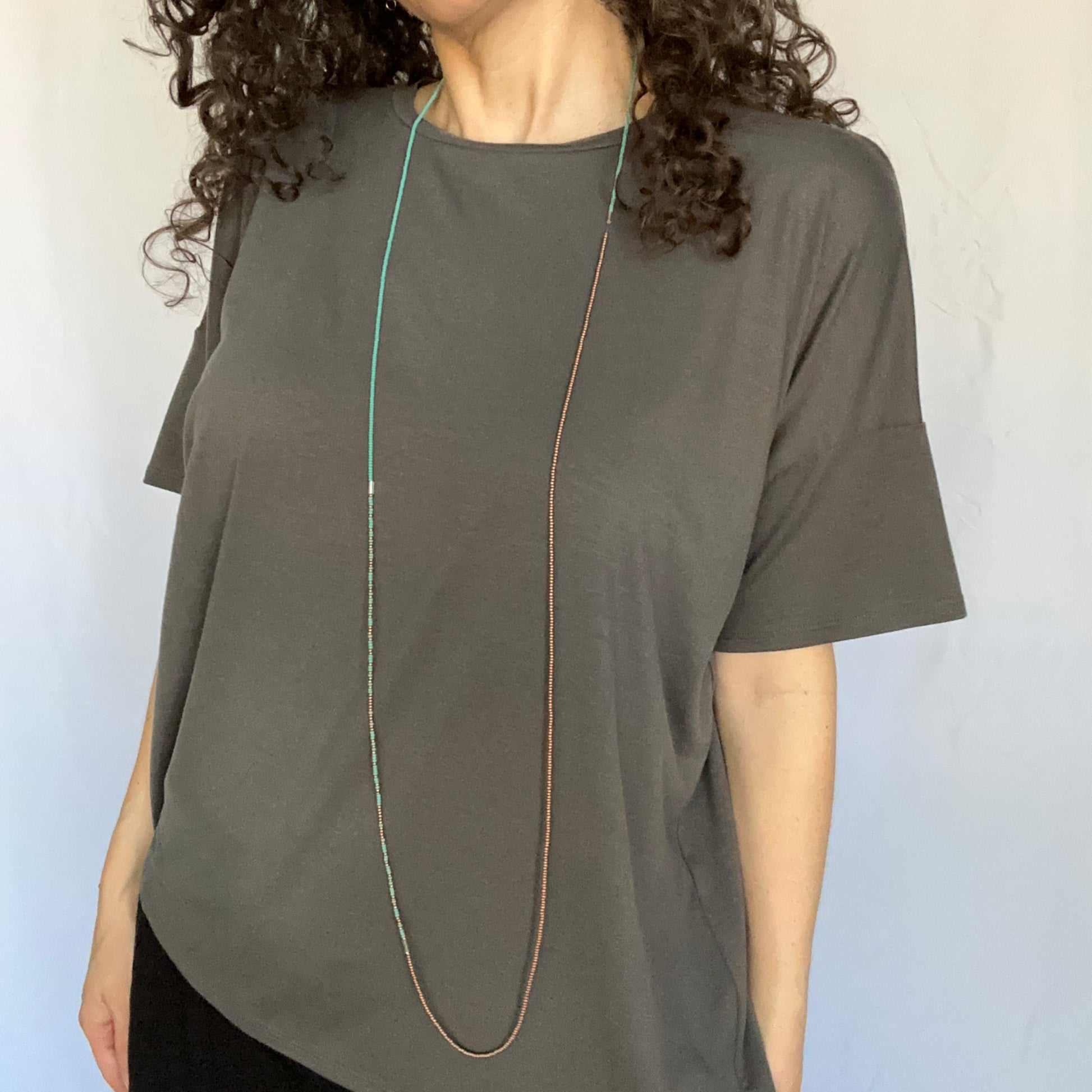 The wrap is approximately 50 inches long and can be worn several ways, including wrapped around your wrist, as a long necklace, and as a doubled necklace! It is made from tiny glass seed beads that are strung on a durable stretch cord for maximum versatility and easy wear.
