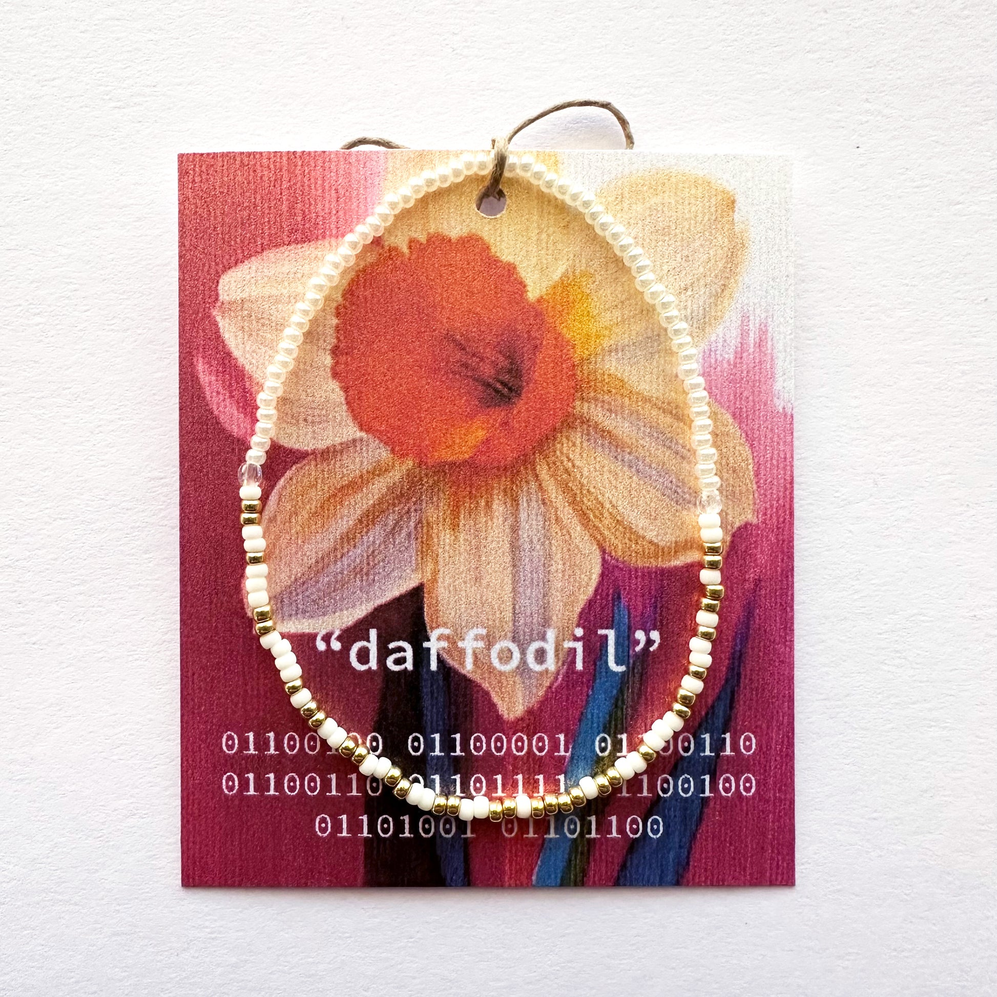 "daffodil" is coded into this bracelet using colors to represent binary code - the computer language of zeros and ones.