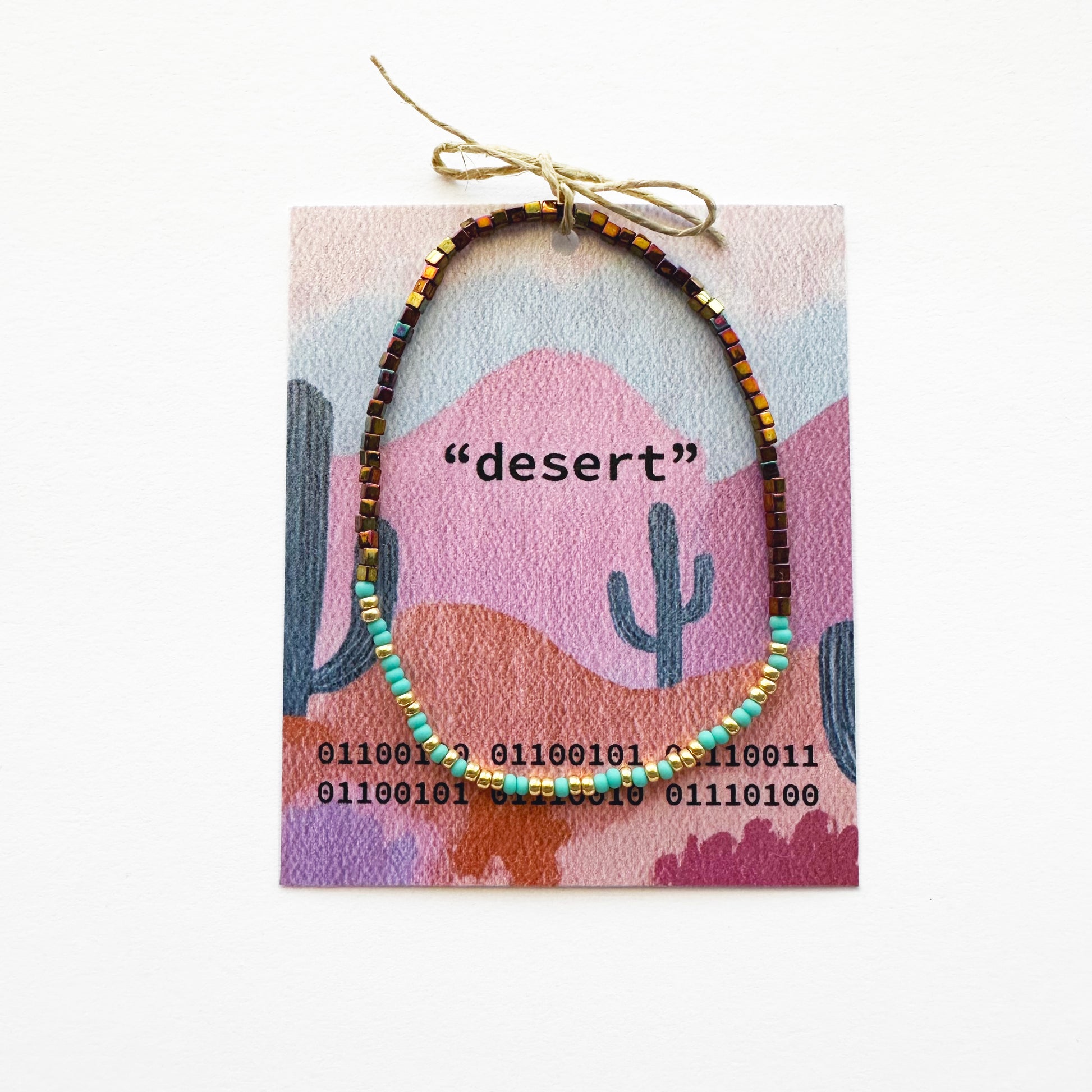 "desert" is coded into this bracelet using colors to represent binary code - the computer language of zeros and ones. It is made from delicate glass beads that are strung on a durable stretch cord for maximum versatility and easy wear.
