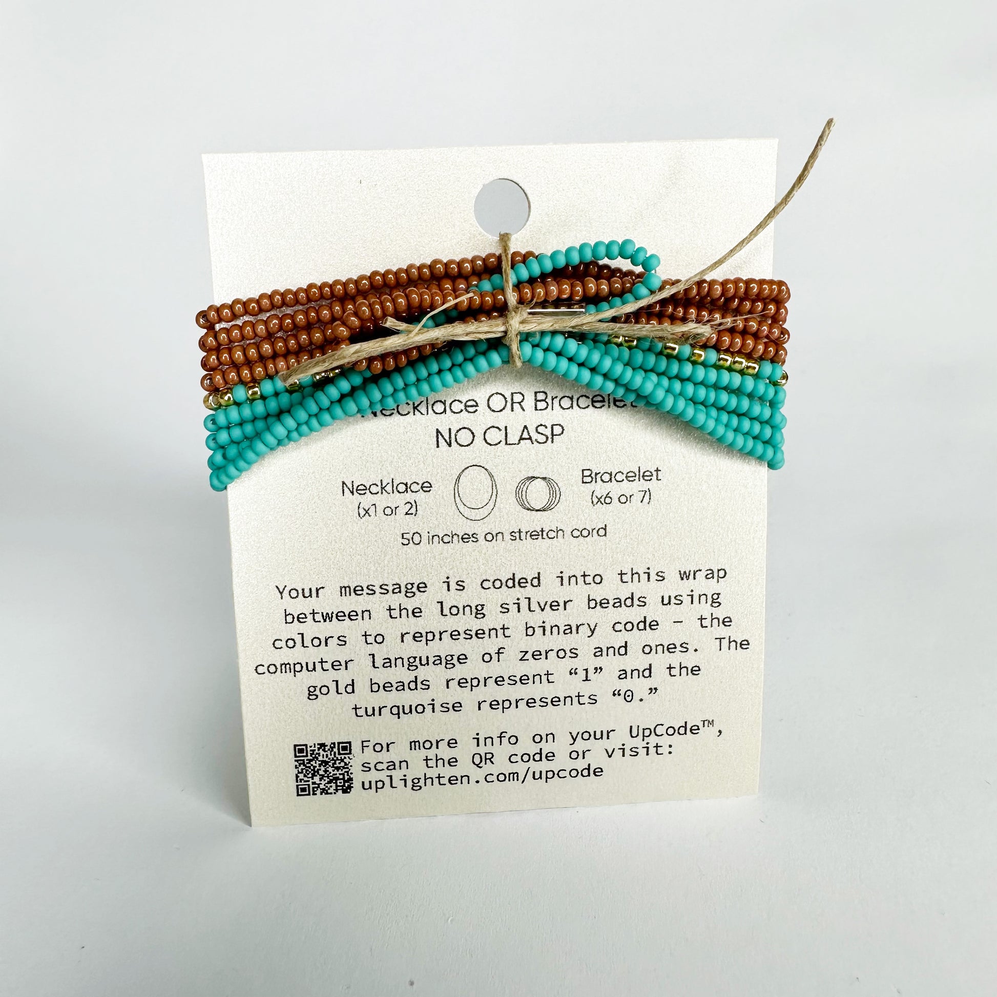 The green turquoise glass beads represent “0” and gold represents “1.” The code is terminated on each side with a long silver-lined glass bead and finished on one side with turquoise, and the other with walnut color beads.