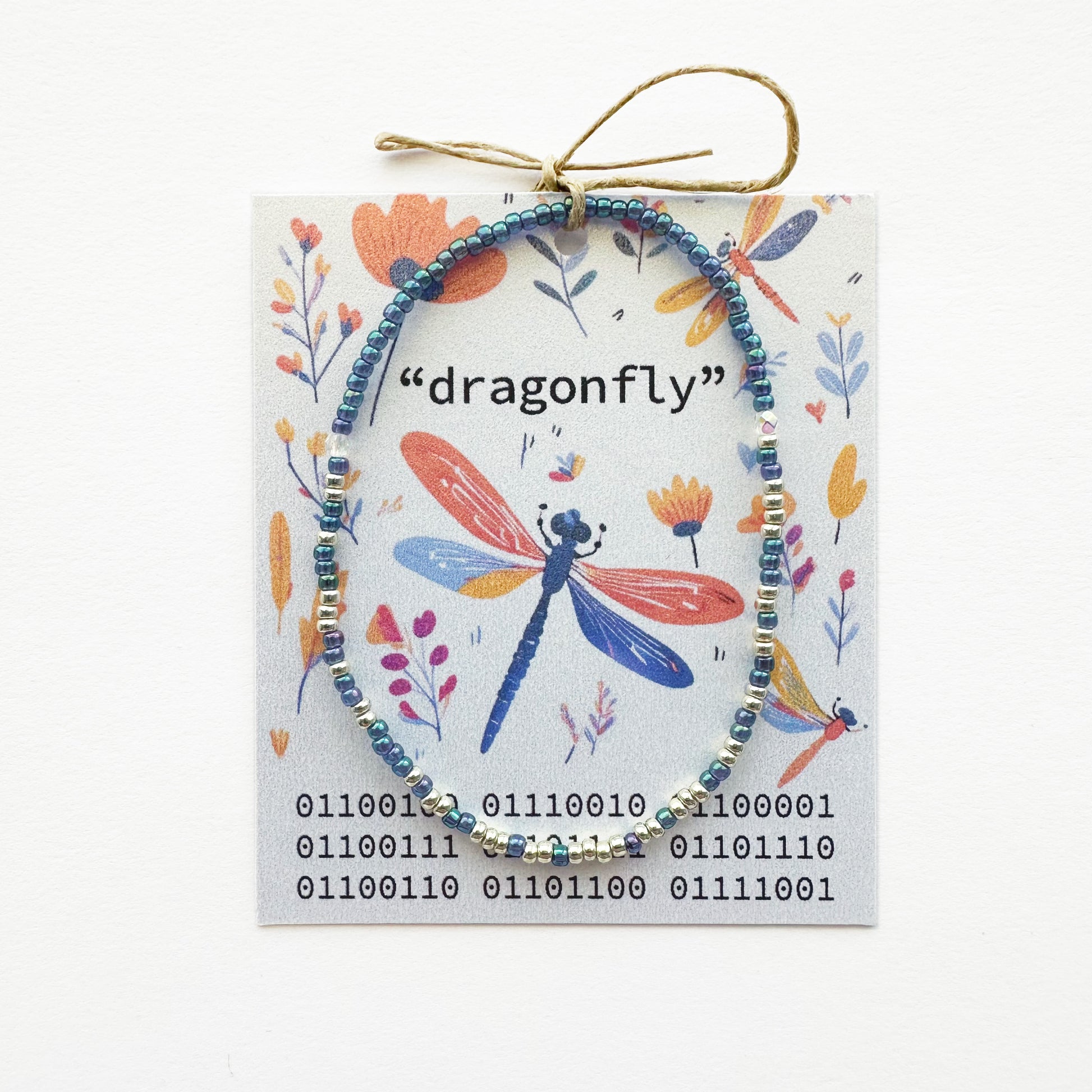 "dragonfly" is coded into this bracelet using colors to represent binary code - the computer language of zeros and ones. It is made from delicate glass beads that are strung on a durable stretch cord for maximum versatility and easy wear.