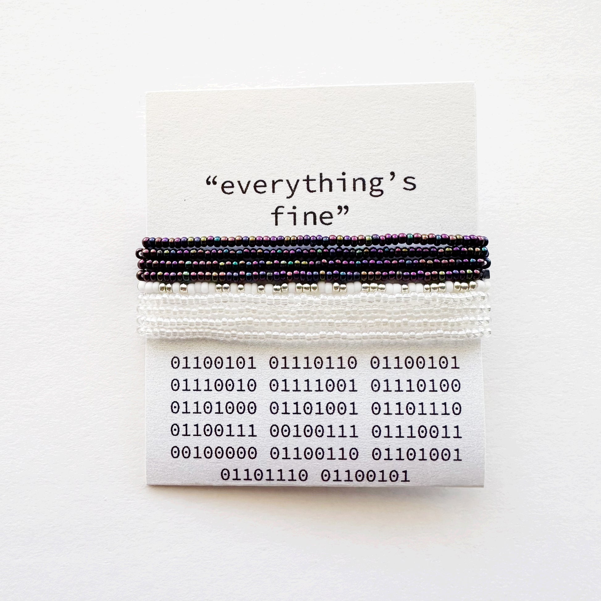 "everything's fine" is coded into this necklace/bracelet wrap using colors to represent binary code - the computer language of zeros and ones.