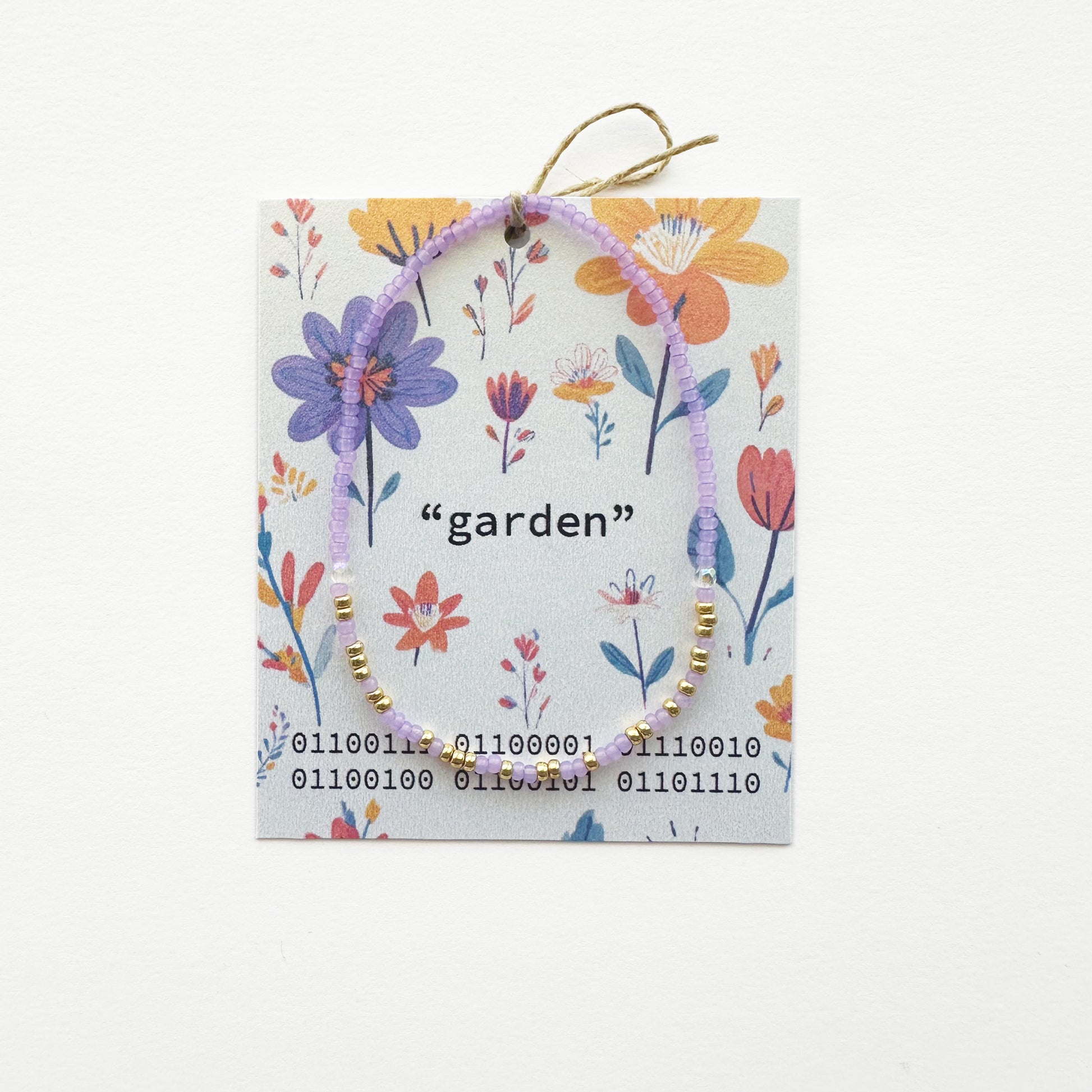 "garden" is coded into this bracelet using colors to represent binary code - the computer language of zeros and ones. It is made from delicate glass beads that are strung on a durable stretch cord for maximum versatility and easy wear.
