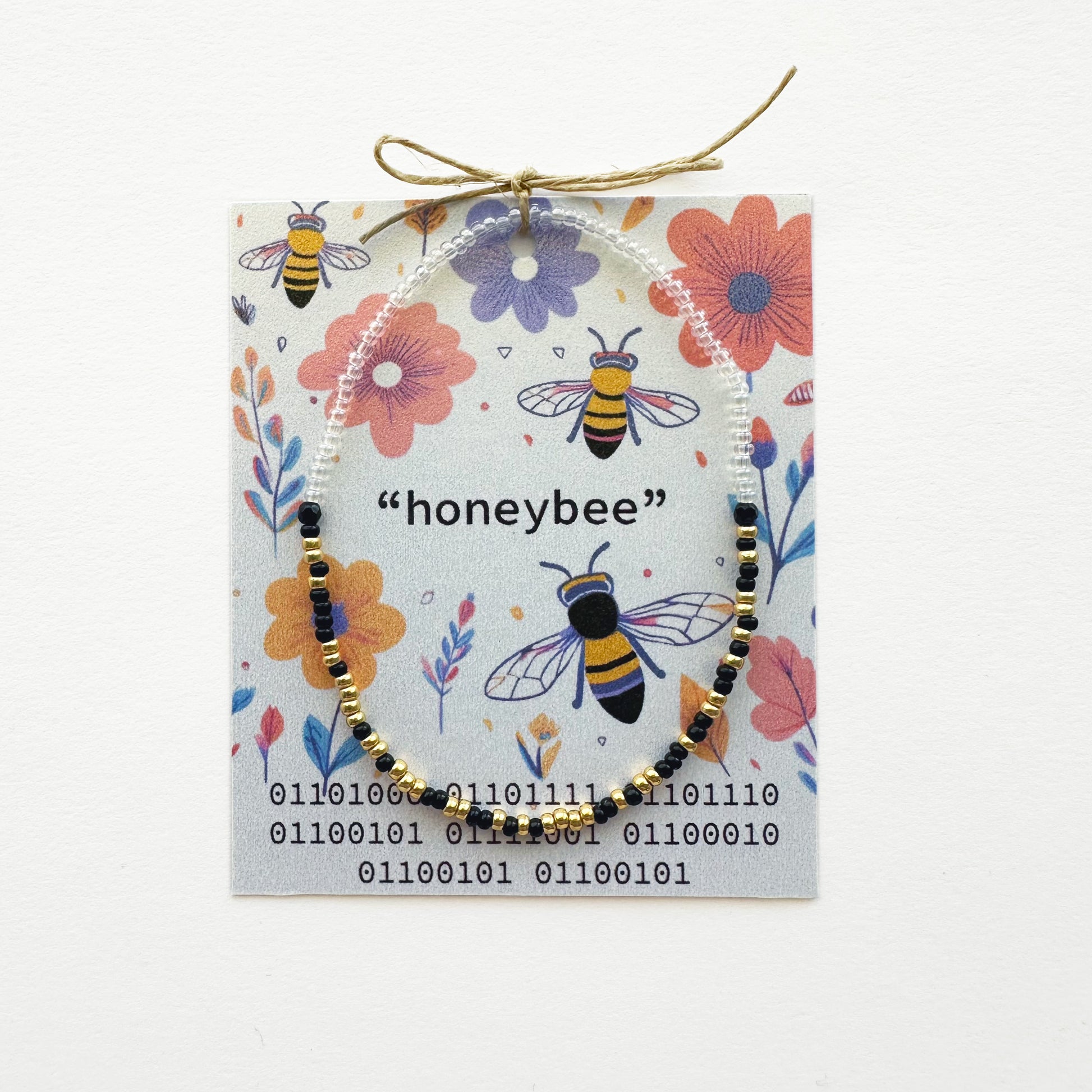 "honeybee" is coded into this bracelet using colors to represent binary code - the computer language of zeros and ones. It is made from delicate glass beads that are strung on a durable stretch cord for maximum versatility and easy wear.