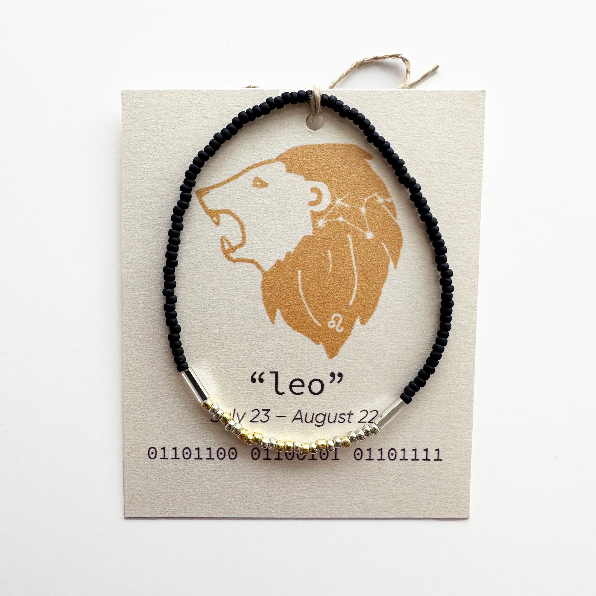 "leo" is coded into this bracelet using colors to represent binary code - the computer language of zeros and ones.