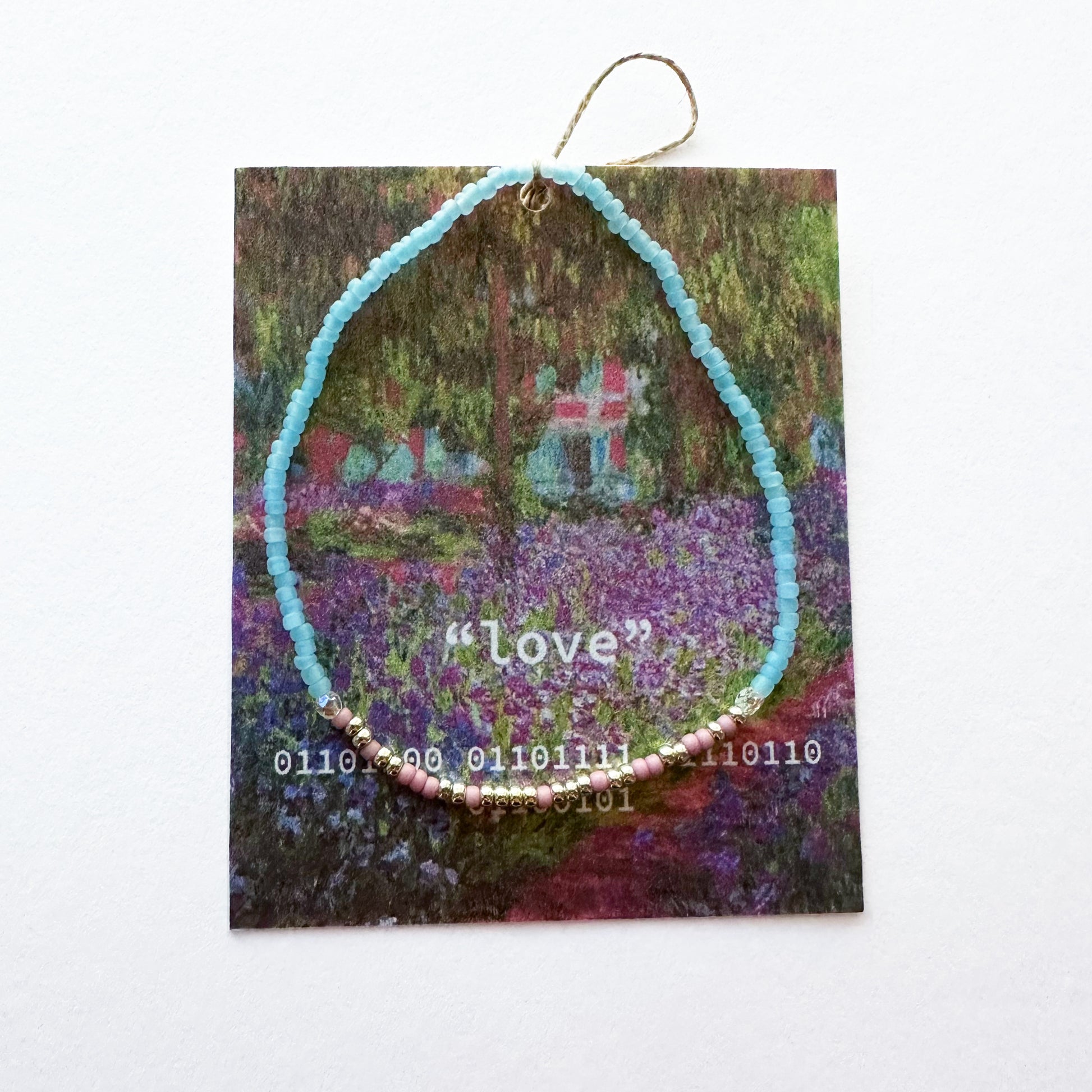 The rose glass beads represent “0” and silver represents “1.” The code is terminated on each side with a square glass bead and finished with irridescent purple beads.