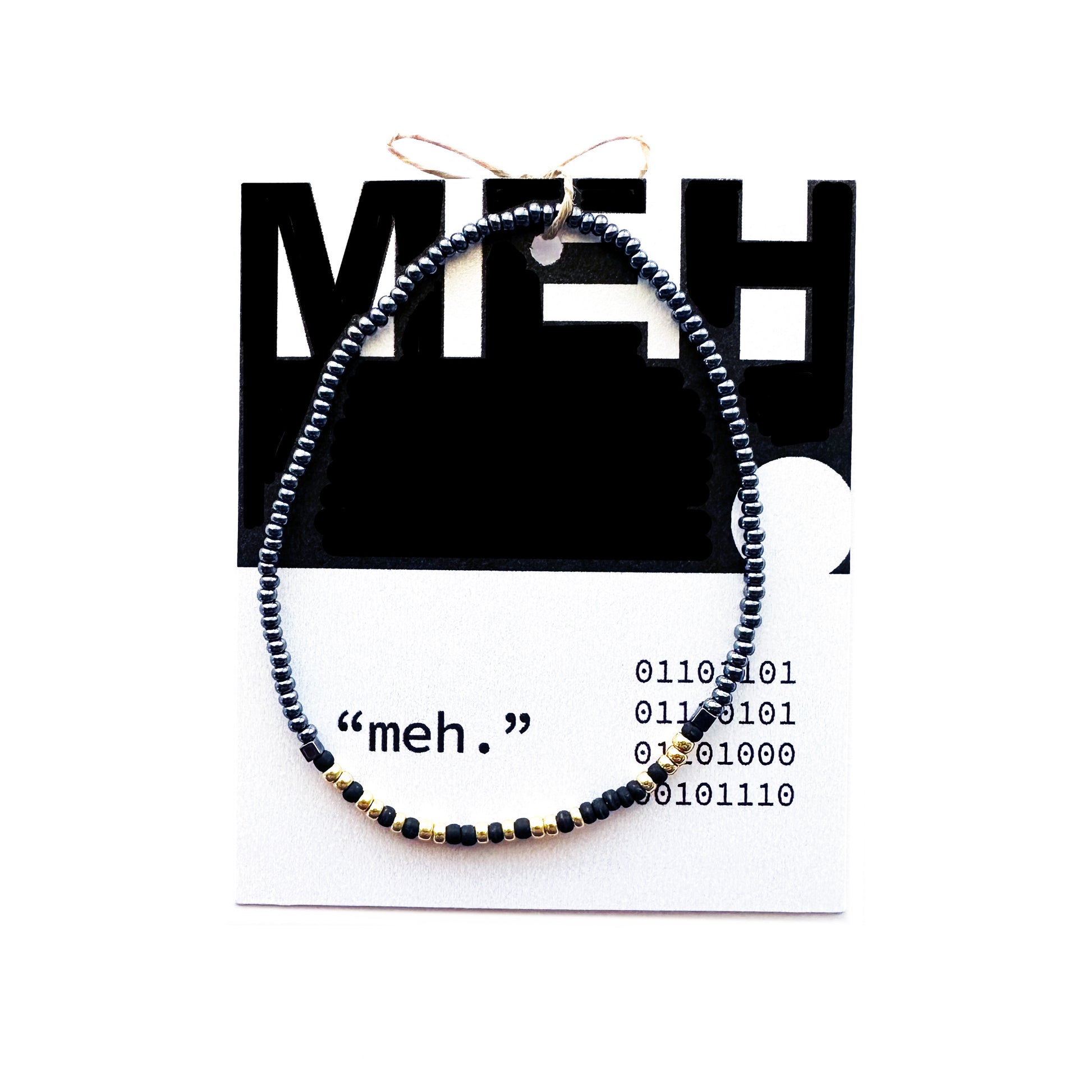 "meh." is coded into this bracelet using colors to represent binary code - the computer language of zeros and ones.