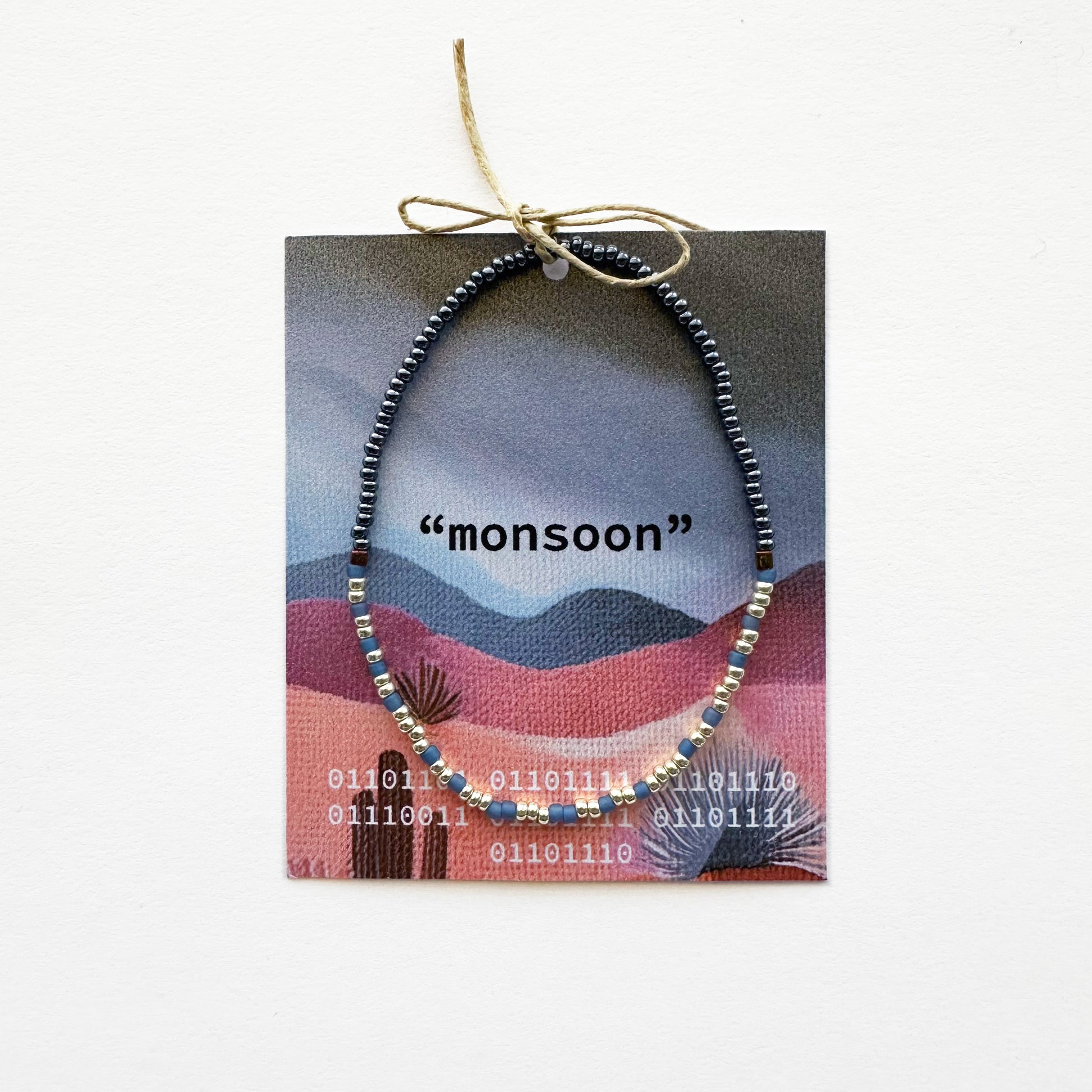 "monsoon" is coded into this bracelet using colors to represent binary code - the computer language of zeros and ones. It is made from delicate glass beads that are strung on a durable stretch cord for maximum versatility and easy wear.