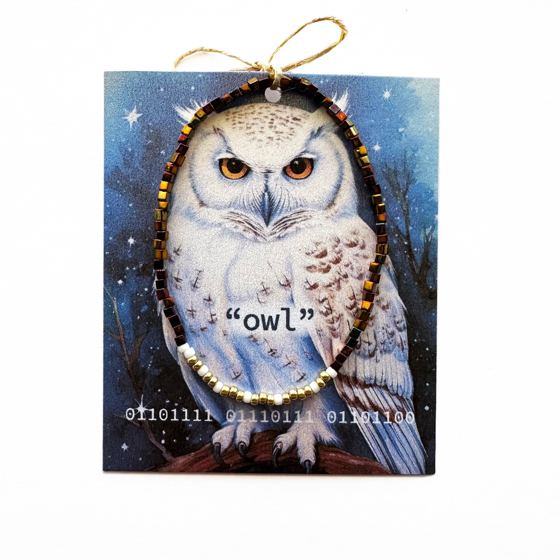 "owl" is coded into this bracelet using colors to represent binary code - the computer language of zeros and ones.