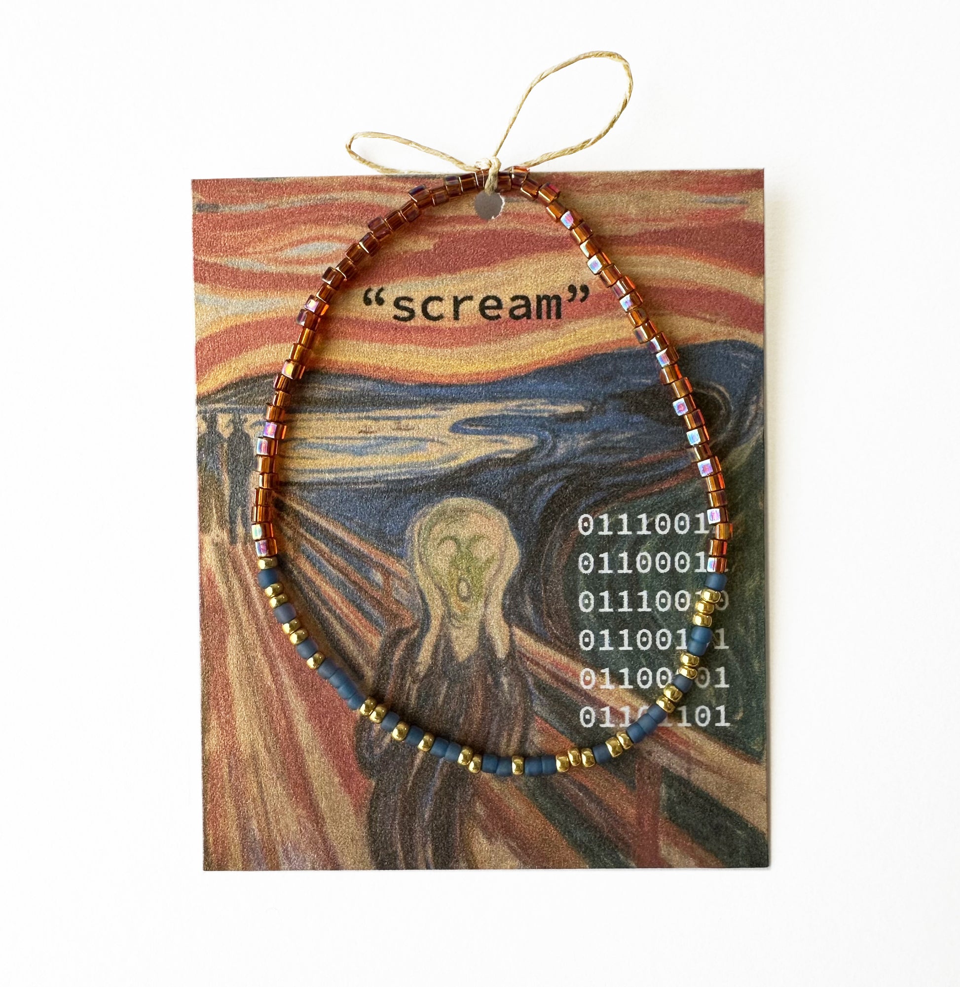 "scream" is coded into this bracelet using colors to represent binary code - the computer language of zeros and ones.