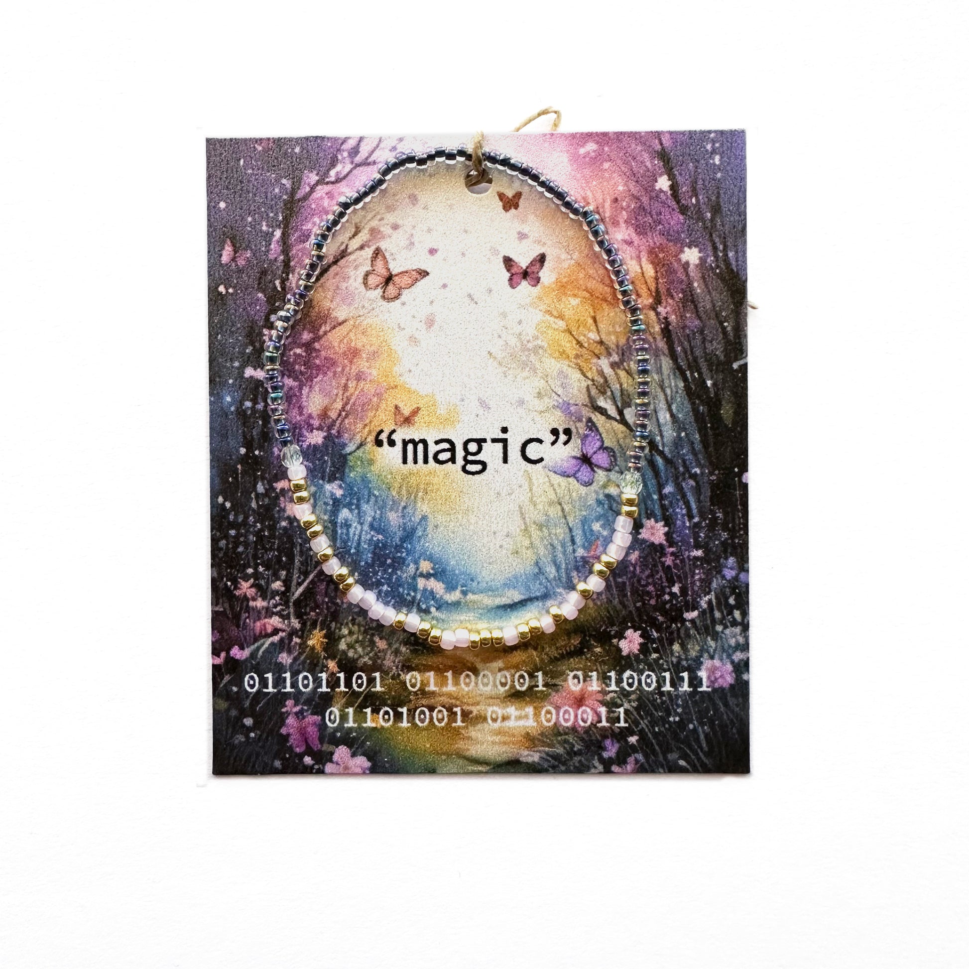 The iridescent pink glass beads represent “0” and gold represents “1.” The bracelet is finished with iridescent clear glass beads with black lining.