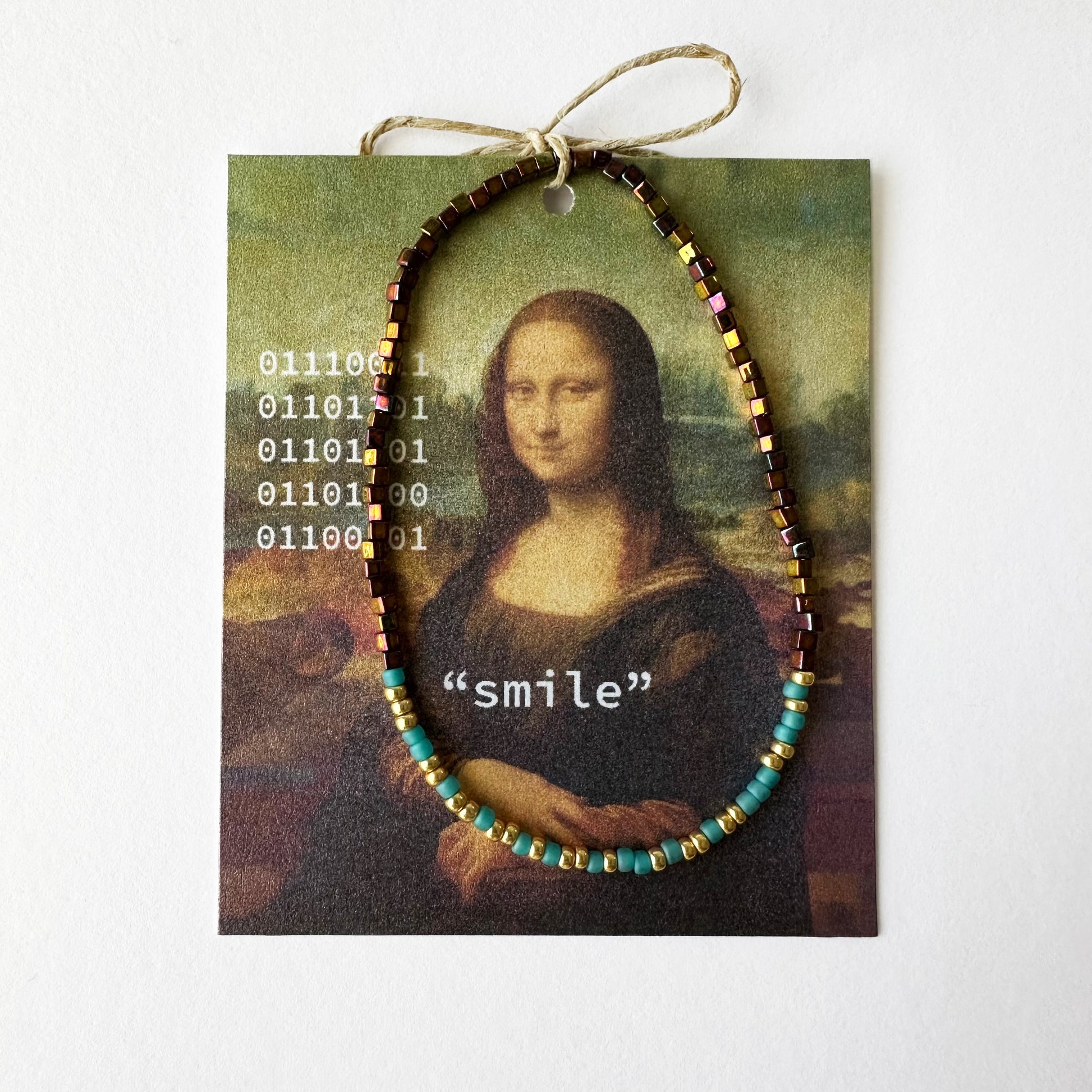 "smile" is coded into this bracelet using colors to represent binary code - the computer language of zeros and ones.