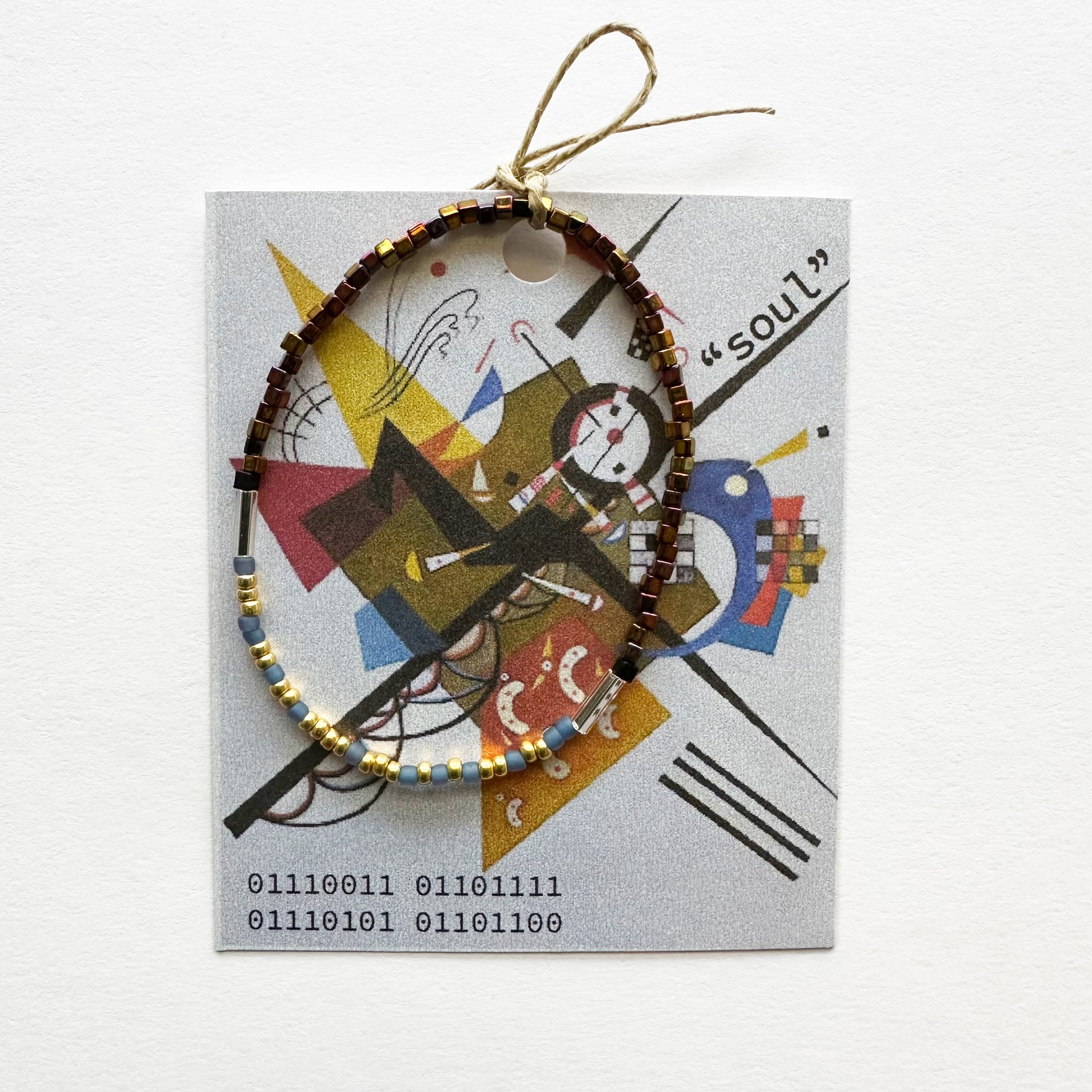 The deep blue glass beads represent “0” and gold represents “1.” The code is terminated on each side with a long silver-lined glass bead and finished with gold bronze square beads.