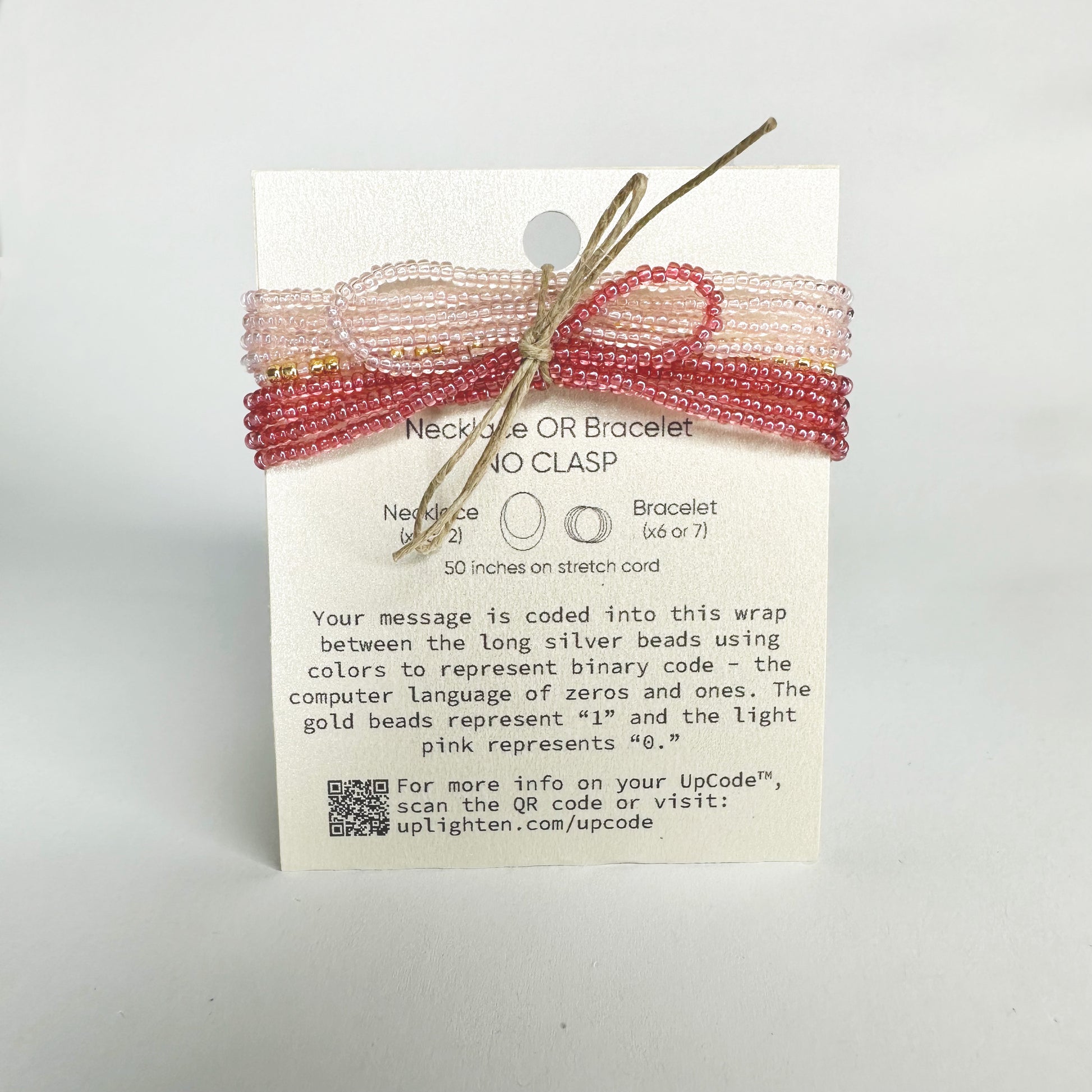 The light pink glass beads represent “0” and gold represents “1.” The code is terminated on each side with a long silver-lined glass bead and finished on one side with rose luster, and the other with light pink beads.