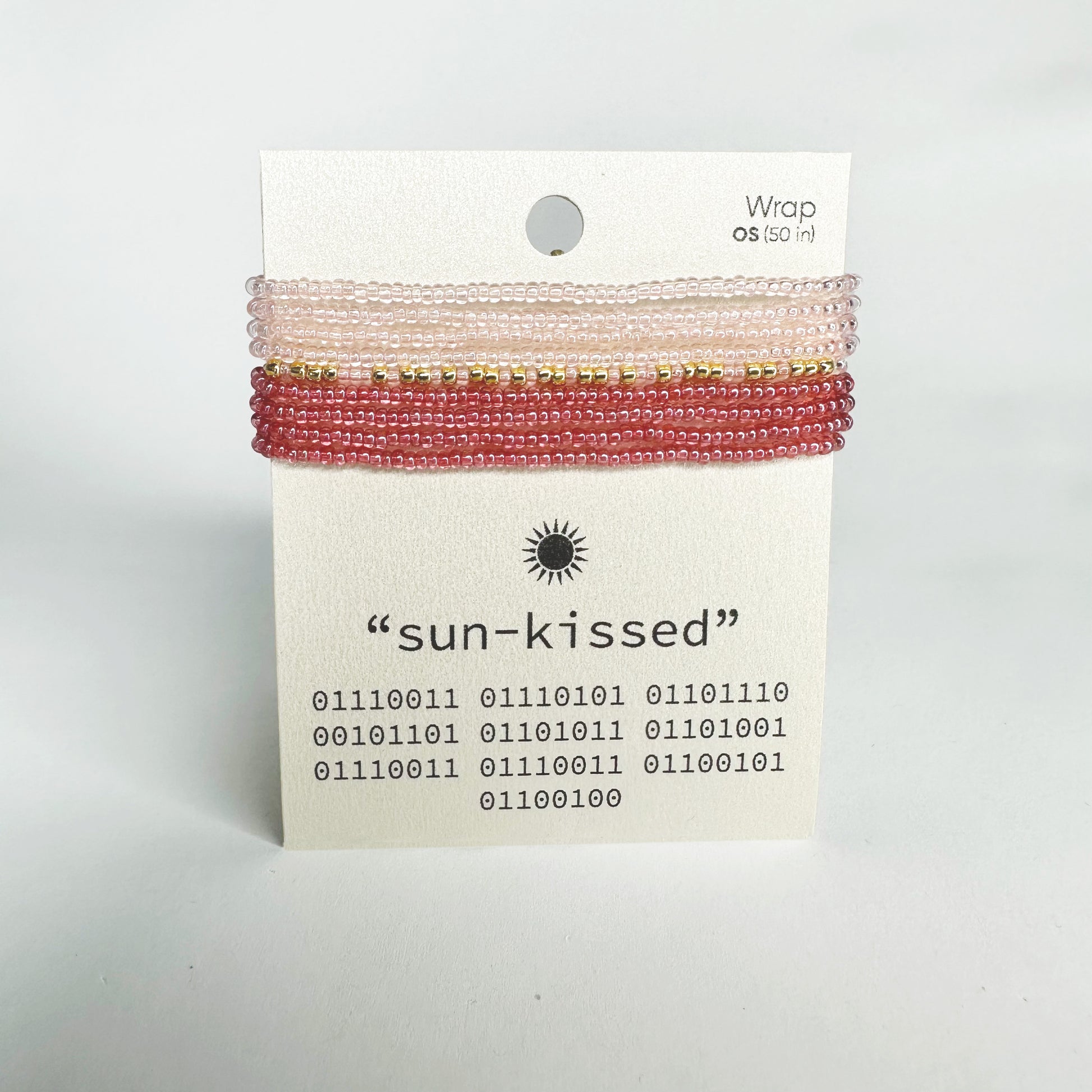 "sun-kissed" is coded into this necklace/bracelet wrap using colors to represent binary code - the computer language of zeros and ones.