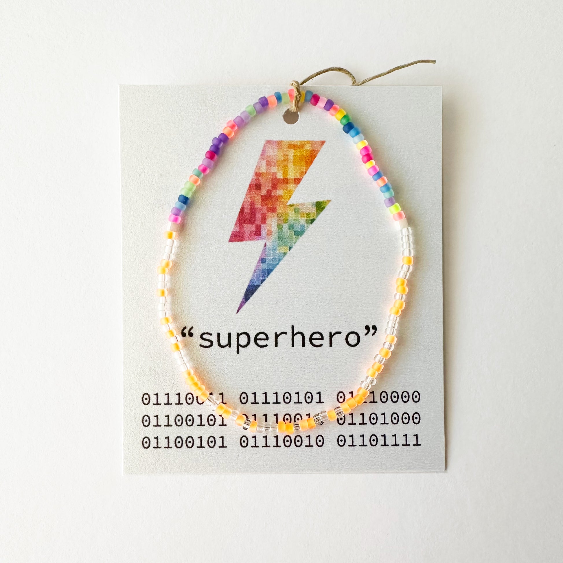 "superhero" is coded into this bracelet using colors to represent binary code - the computer language of zeros and ones.