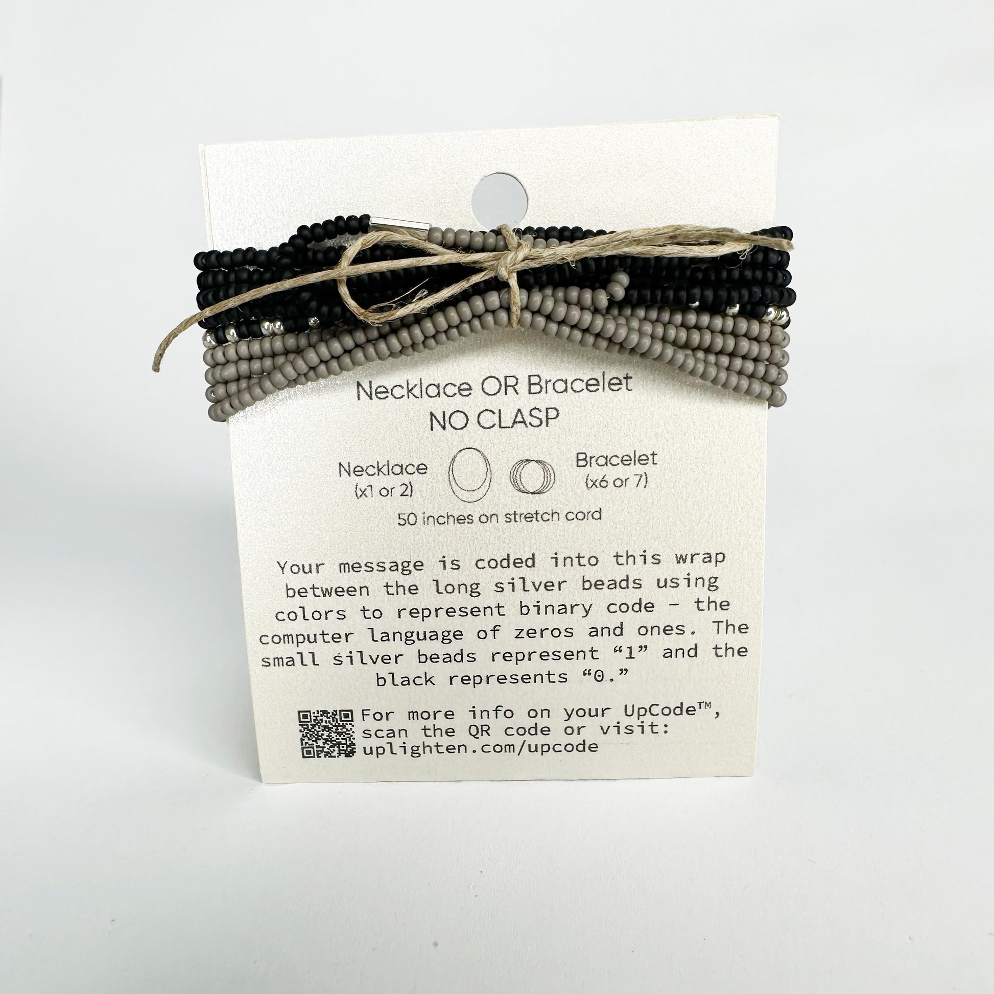 The matte black glass beads represent “0” and silver represents “1.” The code is terminated on each side with a long silver-lined glass bead and finished on one side with black, and the other with gray beads.