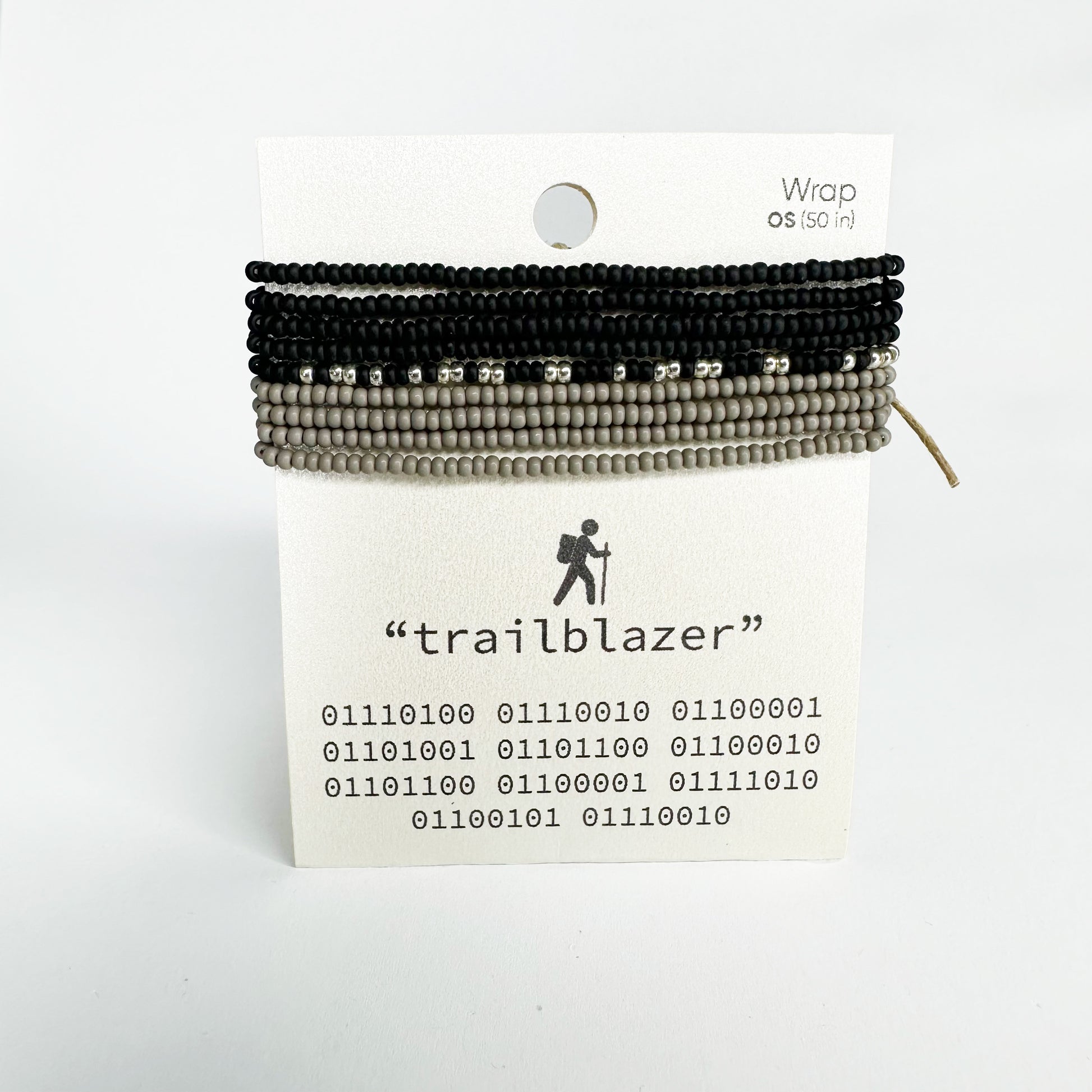 "trailblazer" is coded into this necklace/bracelet wrap using colors to represent binary code - the computer language of zeros and ones.