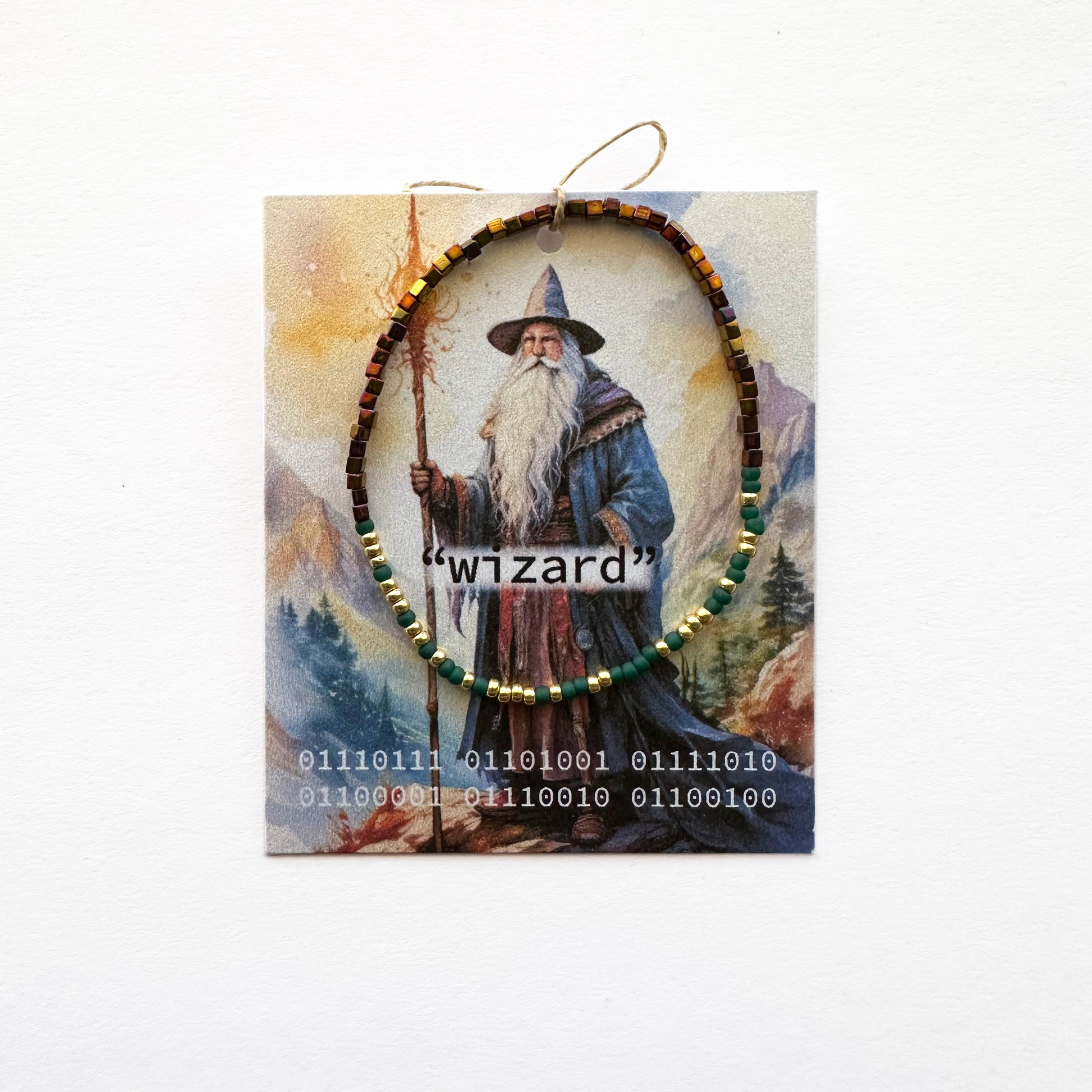 "wizard" is coded into this bracelet using colors to represent binary code - the computer language of zeros and ones.