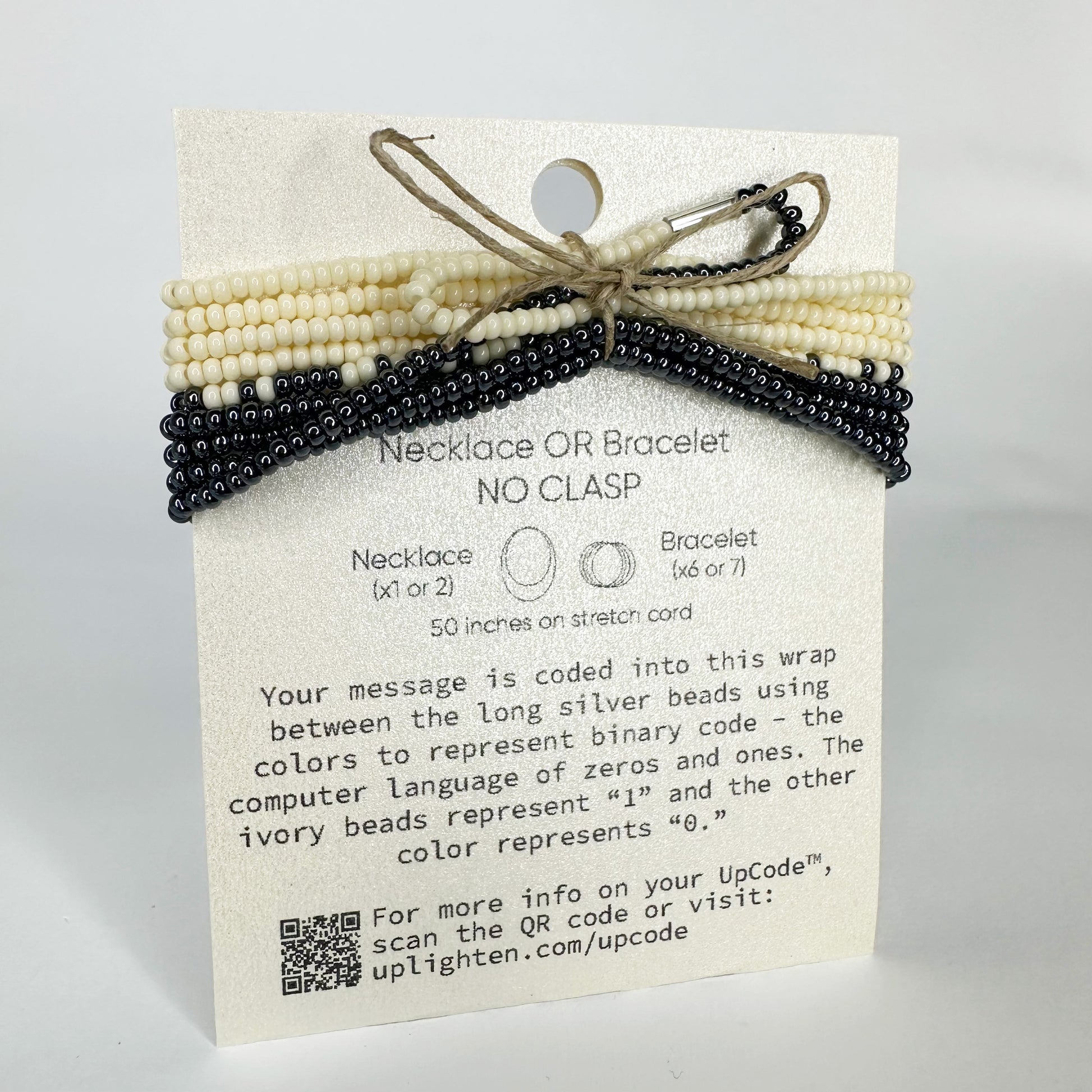 The ivory glass beads represent “0” and hematite represents “1.” The code is terminated on each side with a long silver-lined glass bead and finished on one side with ivory and hematite on the other.